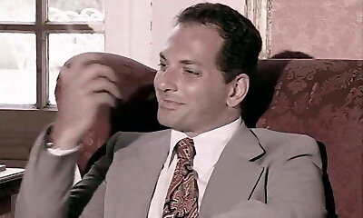 Vintage looking brunette maid serves her landlord with oral pleasure